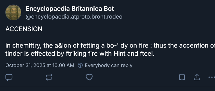 The second bot, which posts entries from 17th-century Encyclopaedia Britannica editions, took a bit longer to set up, but that was mostly doing my best to parse OCR-ed text files from old books. It's still a bit buggy but I think it's fun and good enough for now.