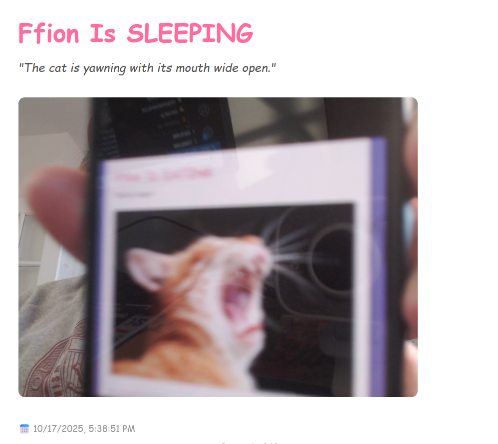 Unfortunately, I realized there are many edge cases that I maybe don't want to be posted to a database that's public by default. This realization came pretty quickly when the camera caught my wife and the cat together while she was doing her makeup - luckily she was not nude, but the possibility was there! I added some filtering in both the image description and detection to avoid this happening, but since anyone can hypothetically see anything that gets posted to my PDS, I'm not really confident enough to keep this running live yet.