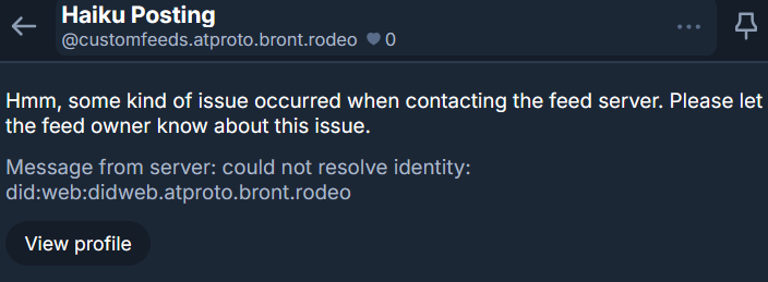 atproto.bront.rodeo/haikus) but even running my server at that path and redefining my.well-known/did.jsonto use it as an endpoint didn't solve it, so I'm running it from thedidwebsubdomain.Again, the lack of devtools is frustrating here: the only way to test what my feed actually looks like is publishing it live. It would be really nice to have some local wrapper to display the feed before you publish. Backfilling a feed is also not super well-documented - obviously people have figured out how to do it, but it seems like something that should be a default option and not monkeypatched by users.